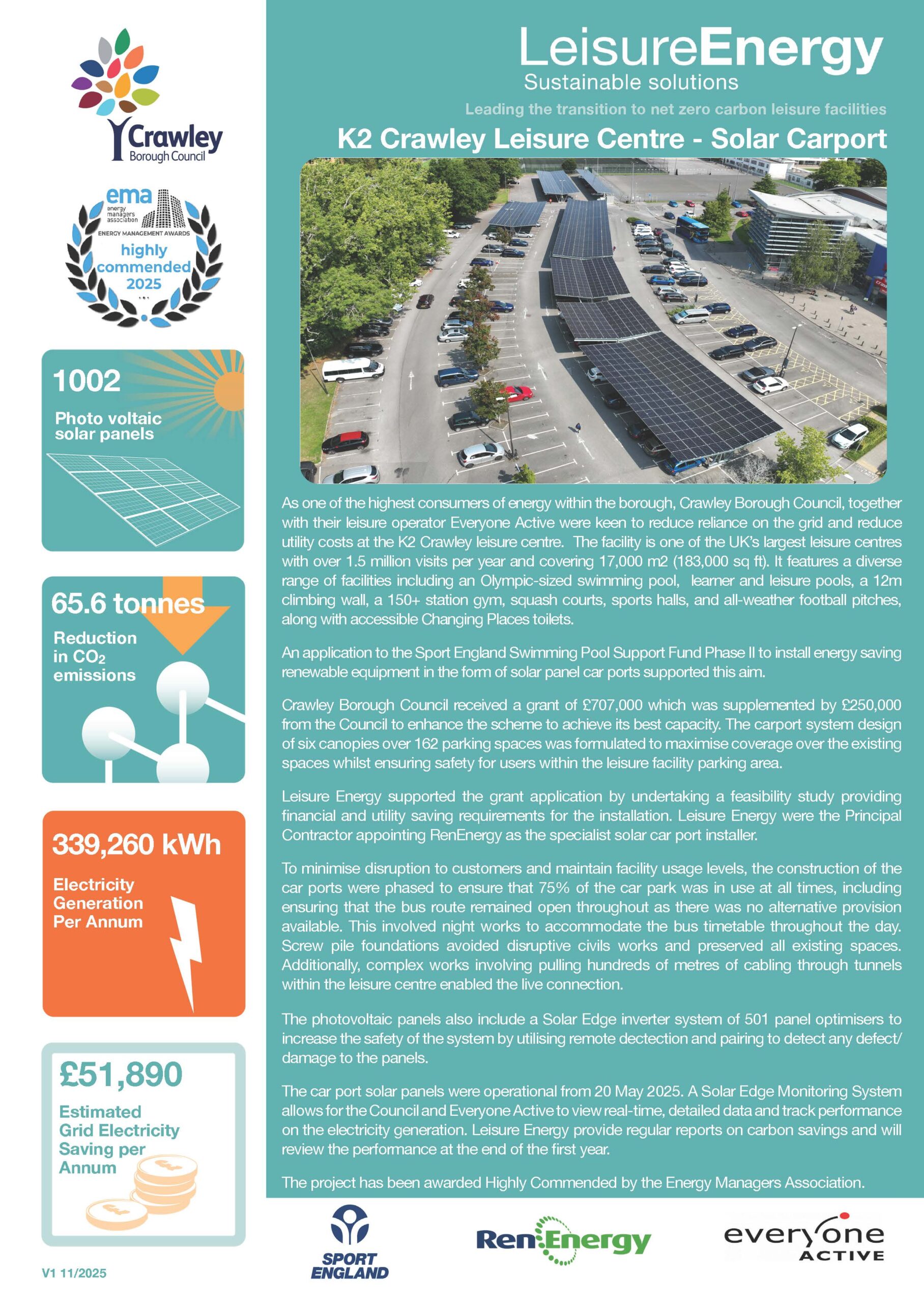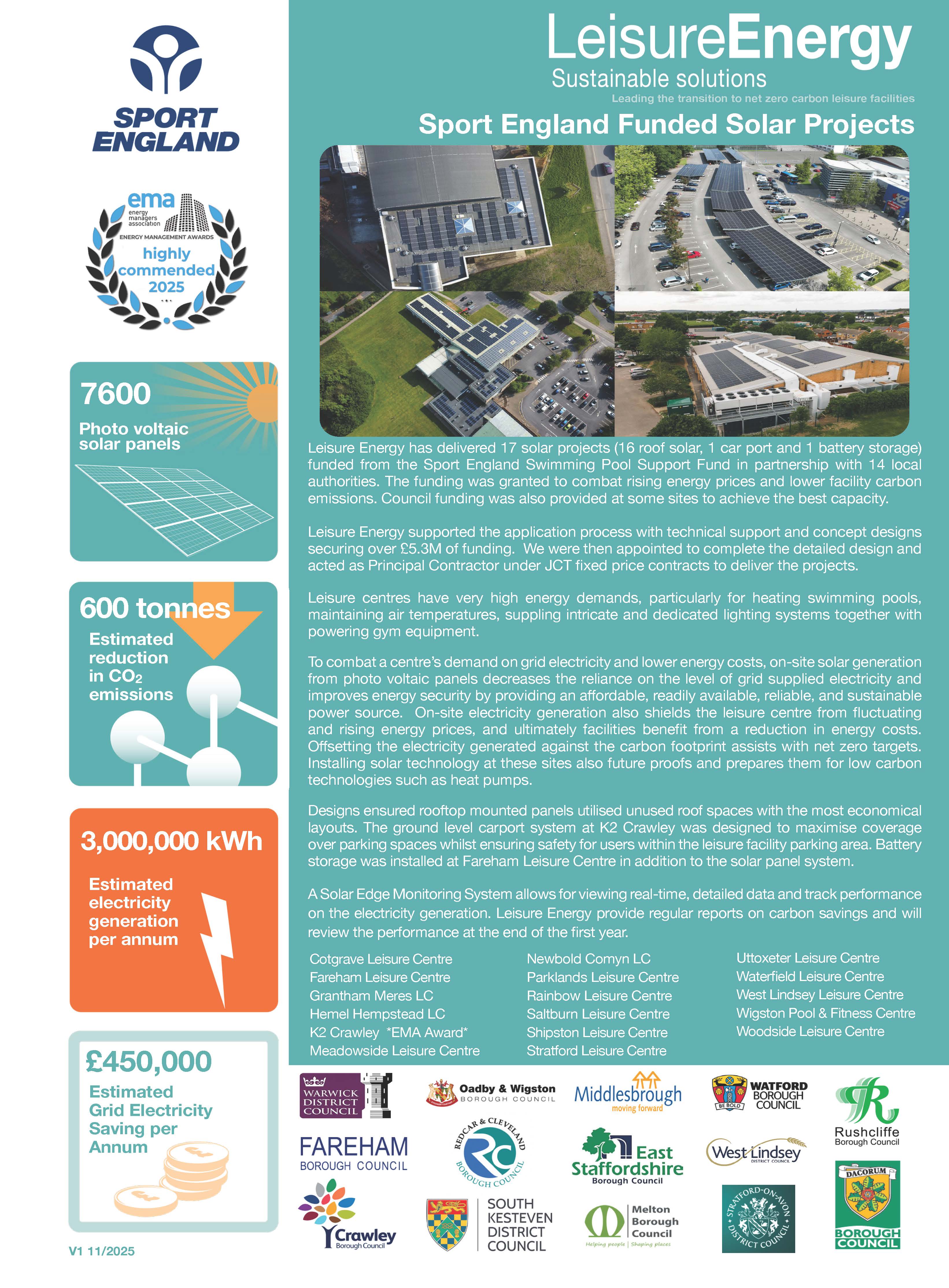 Leisure Energy has delivered 17 solar projects (16 roof solar, 1 car port and 1 battery storage) funded via the Sport England Swimming Pool Support Fund working in partnership with 14 local authorities. The funding was granted to combat rising energy prices and lower facility carbon emissions. Council funding was also provided at some sites to achieve the best capacity.