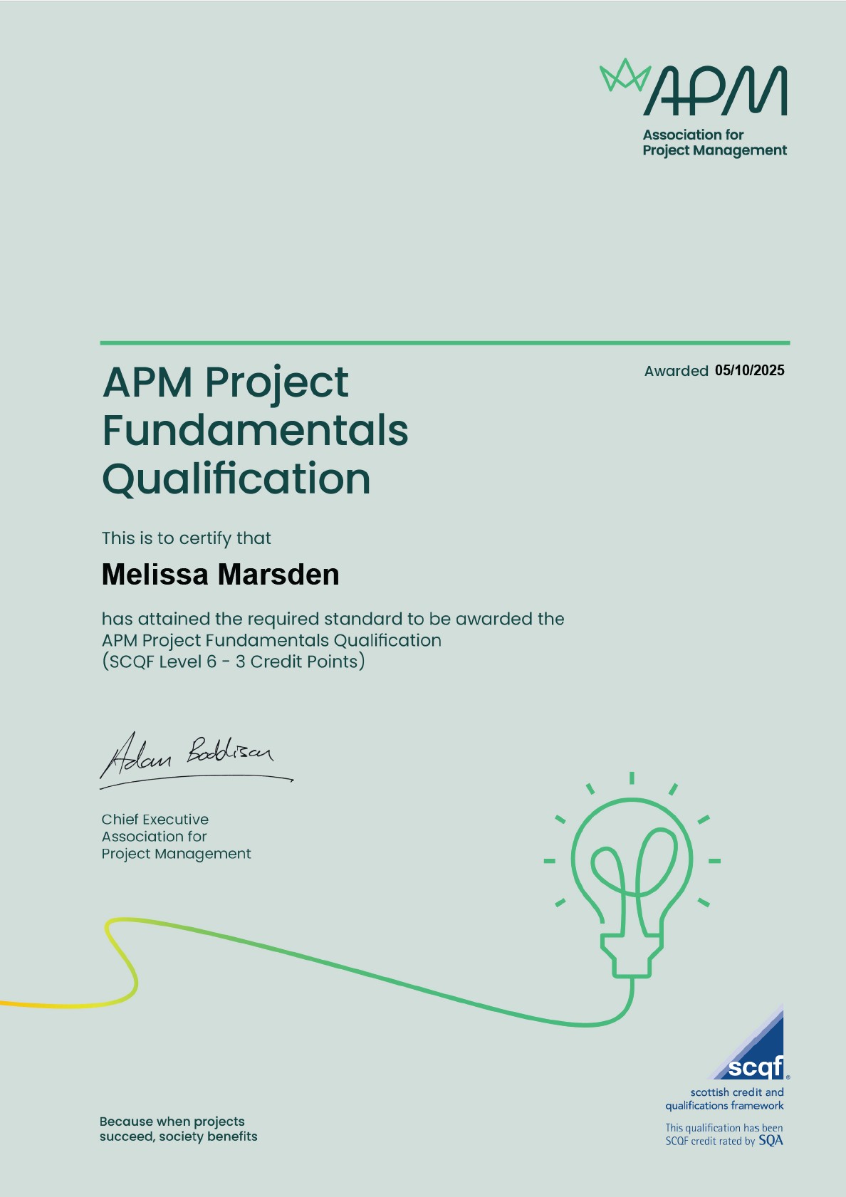 Leisure Energy continue to invest in their staff and are pleased to share that Melissa Marsden, Assistant Project Manager, on her recent successful completion of the APM Project Fundamentals Qualification, a formal